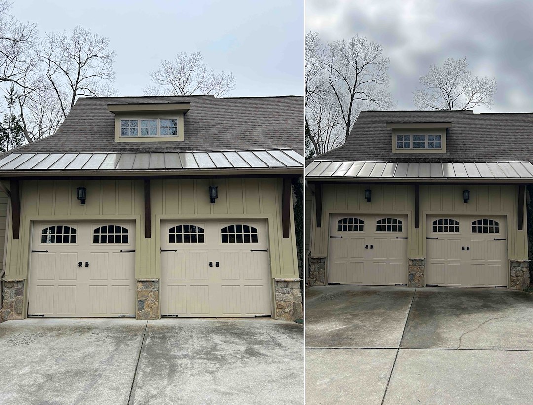 Next, we completed a soft wash of the garage exterior, targeting dirt, mildew, and environmental buildup on siding and trim. Soft washing is ideal here because it allows us to clean thoroughly without forcing water behind surfaces, and it delivers a consistent, like-new finish.