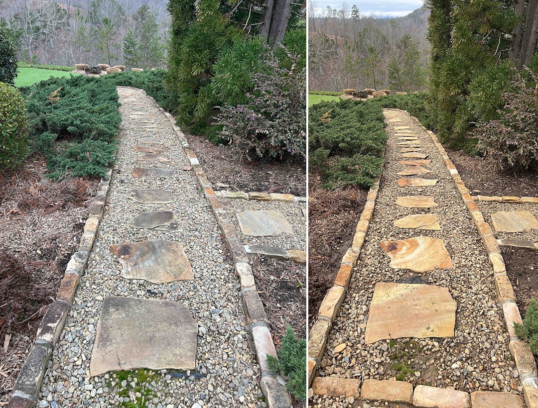 From there, we moved to the flagstone walkway and stone path areas, where we used a soft wash process designed specifically for natural stone. This safely lifts organic growth and grime while preserving the integrity and appearance of the stonework. You can see a major transformation in brightness and color — the stone pops again, and the pathway looks clean, uniform, and inviting.