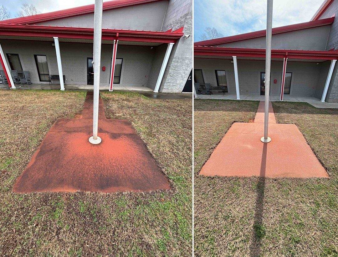 This project was an overdue spring cleaning for the walkways and concrete areas around a fire department station in Taylors, South Carolina. Public-facing properties and high-traffic facilities like fire stations deal with constant wear from foot traffic, vehicles, weather, and seasonal buildup. In the Upstate—especially around Greenville County—concrete surfaces routinely collect pollen, red clay splash, dirt, and organic growth like algae and mildew. Over time, that buildup can leave sidewalks looking dark, stained, and neglected, even when the rest of the property is well maintained.