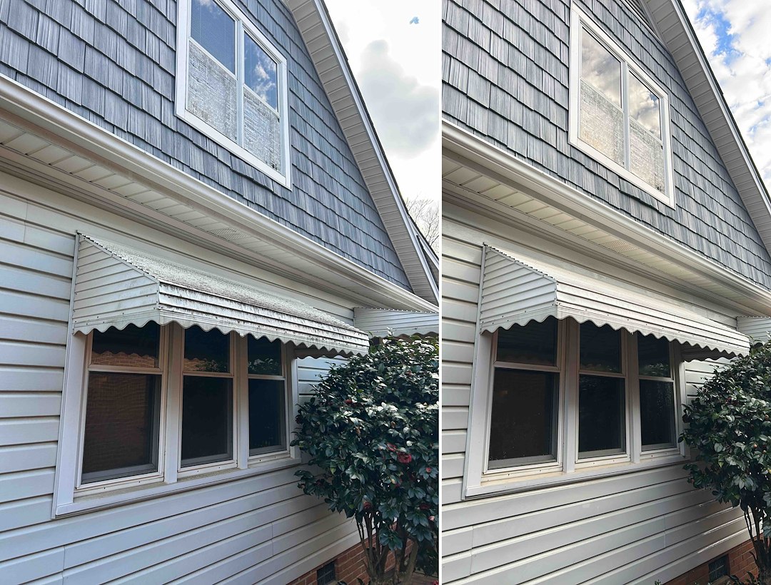Awnings can collect mildew in seams and along edges, so we treated aluminum and vinyl awnings with a gentle detergent and a controlled rinse to restore brightness without causing oxidation streaks. For fabric awnings we adjust the detergent strength and rinse rate to protect the weave and colorfastness while still removing mildew and grime. The finished awnings show a bright, uniform appearance and better visual balance with the cleaned siding and hardscapes.