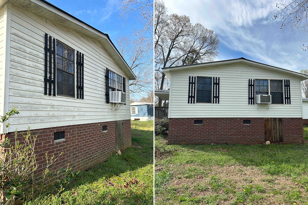 Foothills Hydro Wash completed a soft wash house wash and wood deck cleaning for a homeowner in Clinton, SC. The goal was to remove years of algae and mildew from vinyl siding, soffits, fascia, and trim, and to restore safe footing on a weathered back deck and steps. The property had obvious buildup on shaded walls and slick, darkened deck boards that needed a safe, material-friendly approach.
